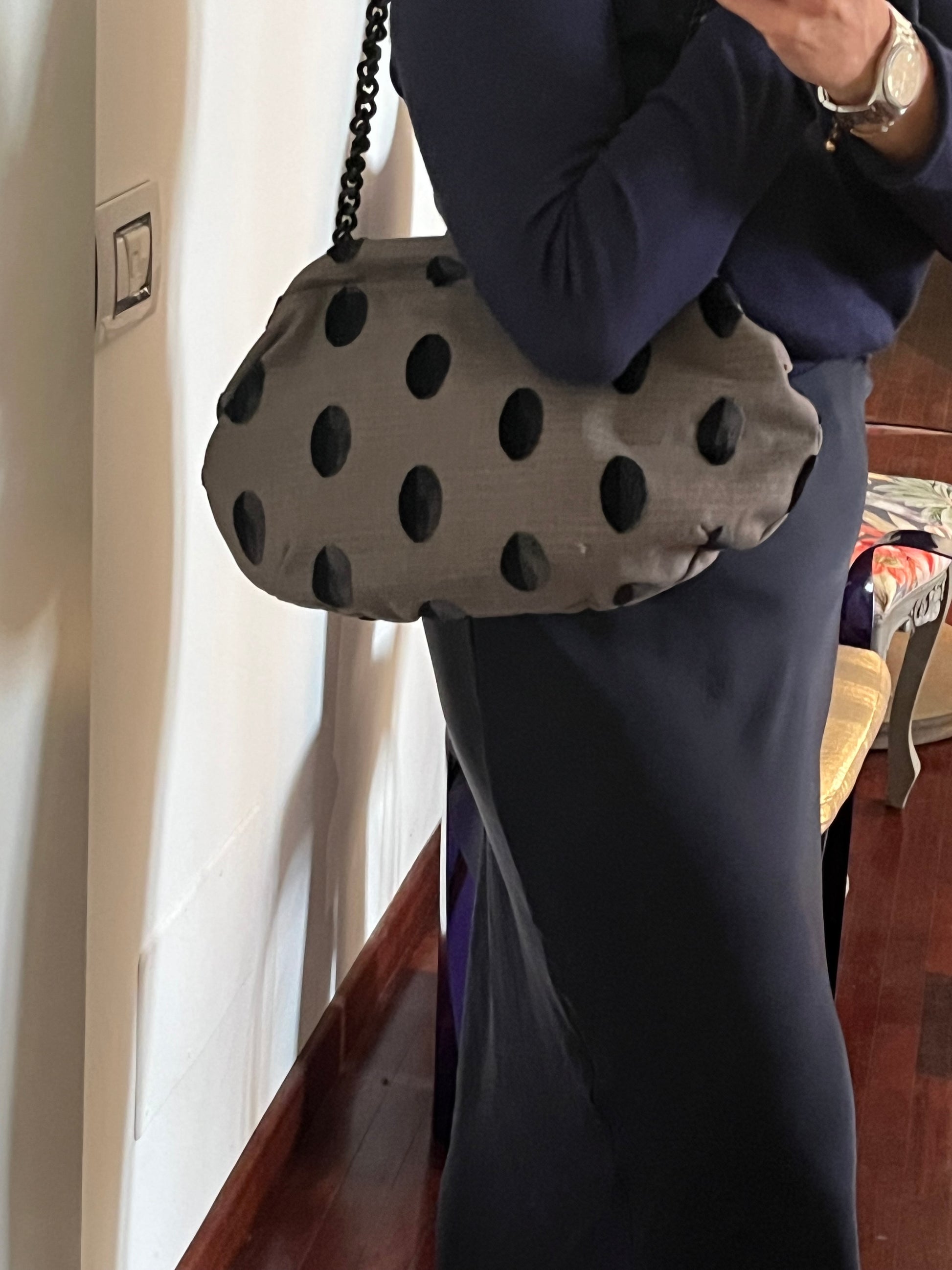 Clutch in velluto grigio e nero, chiusura a molla, tasca interna, catena da portare a spalla