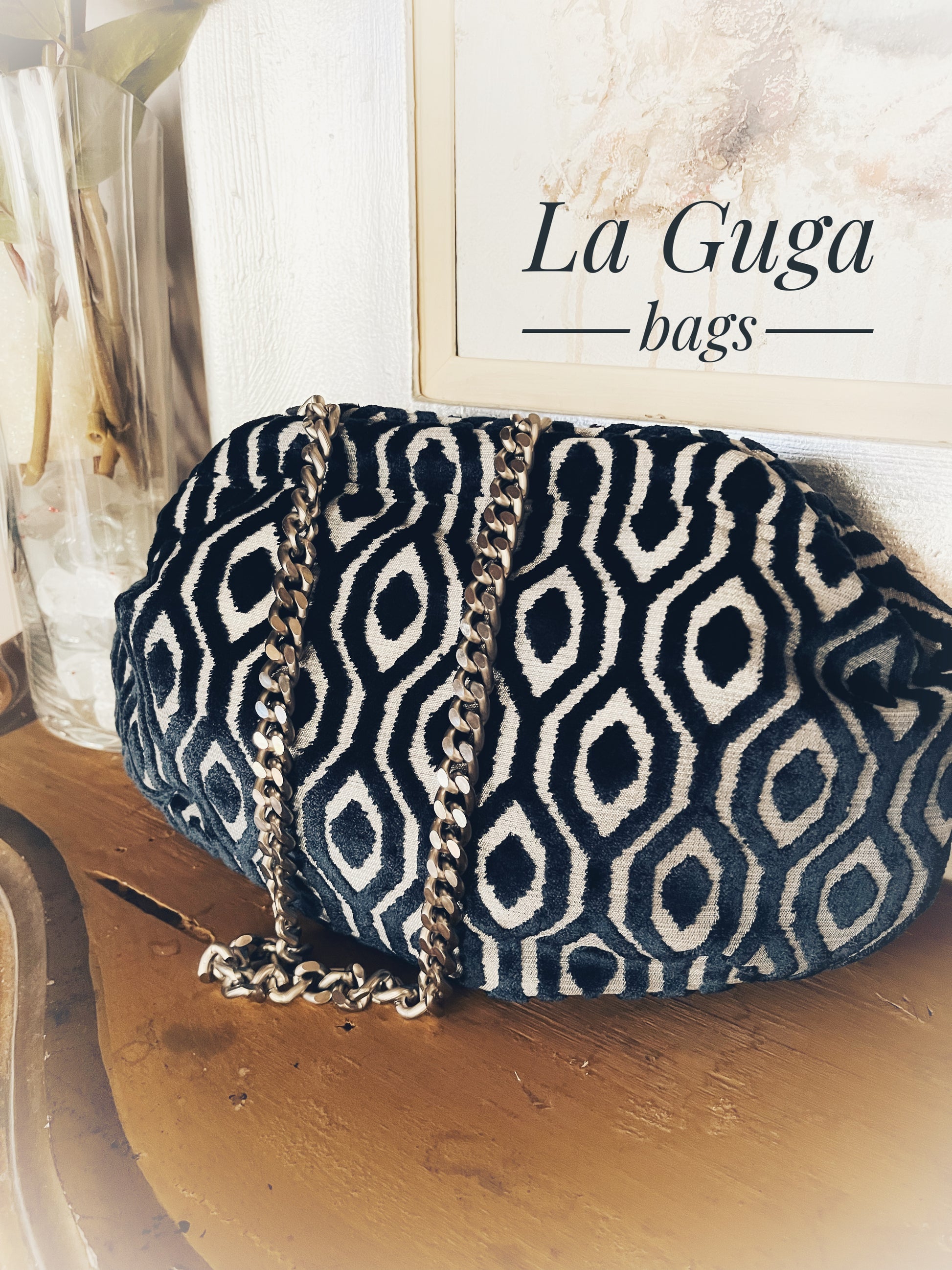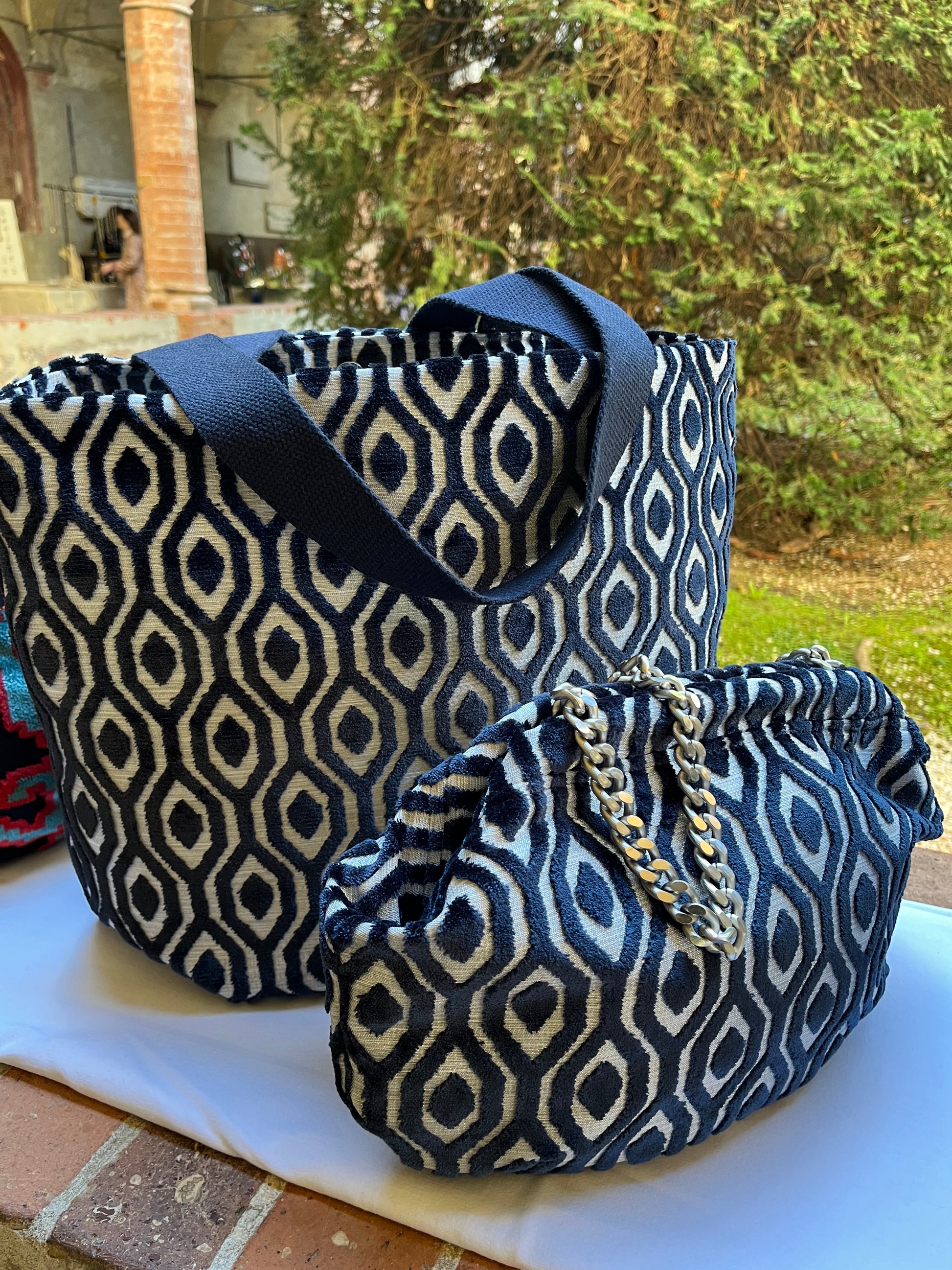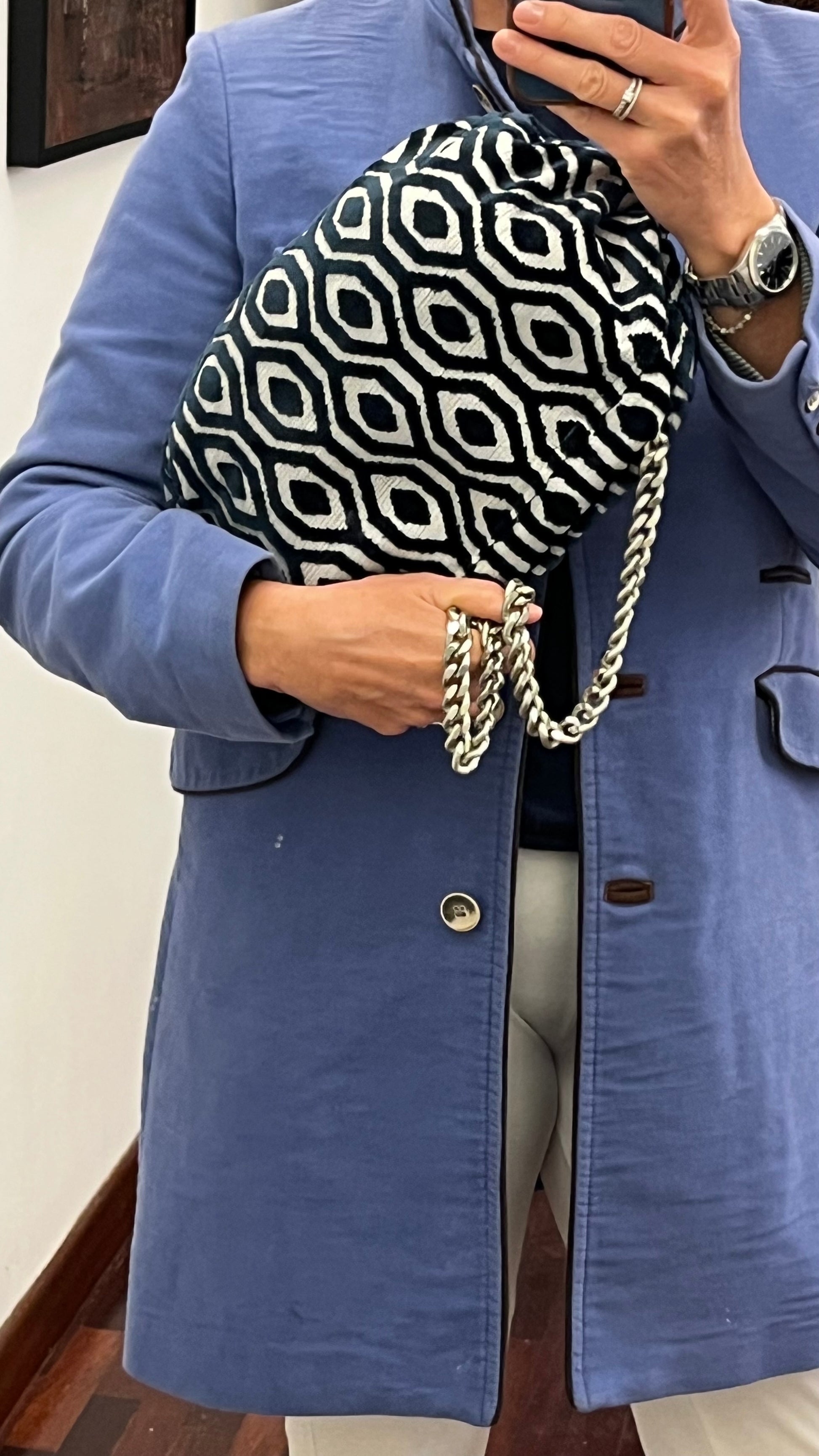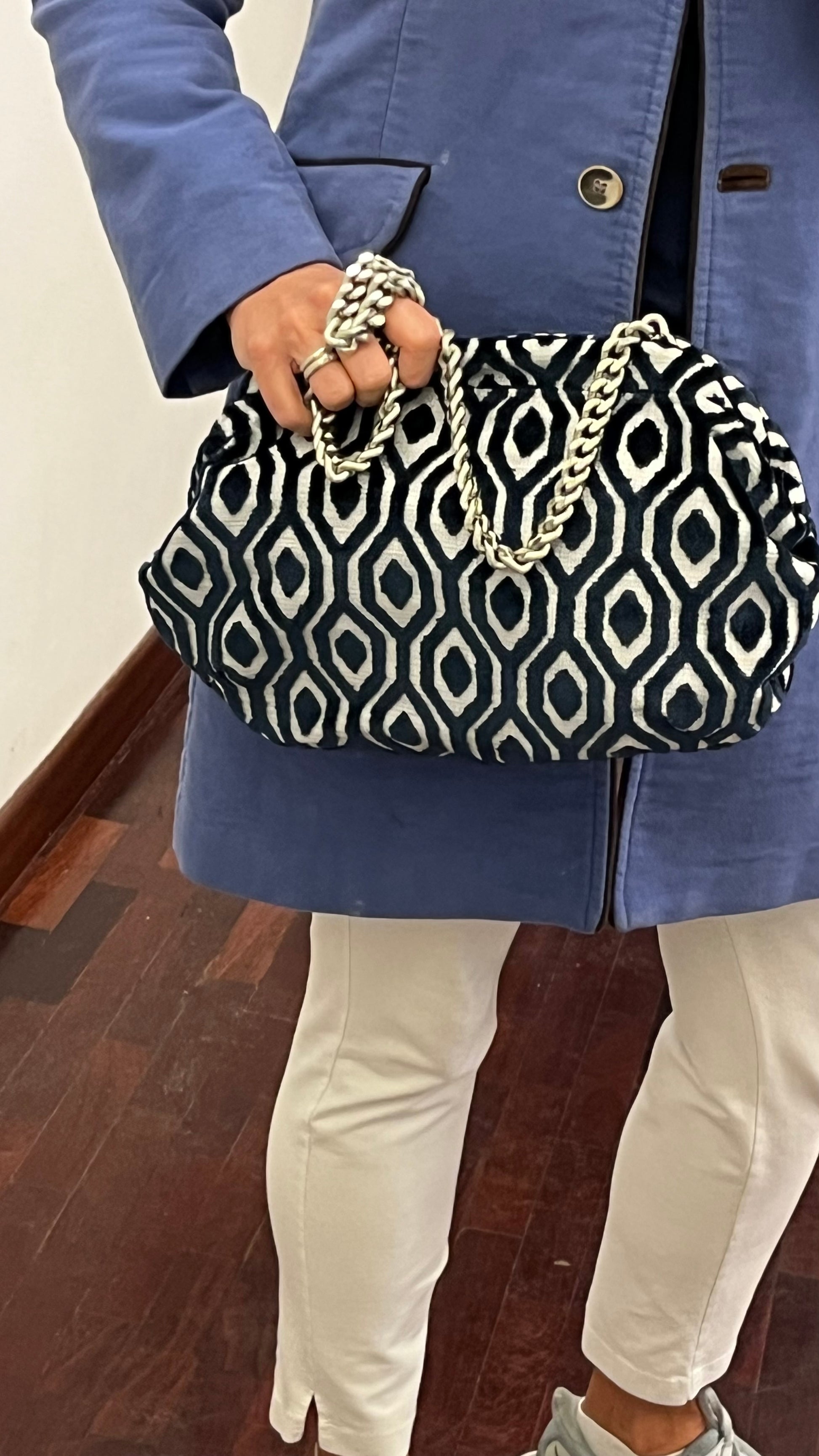 Elegante clutch in velluto dalle tonalità blu. Comoda chiusura e all’interno una pratica tasca. La catena permette di indossare la clutch a spalla sotto il braccio, oppure può essere tenuta all’interno e portata a mano.