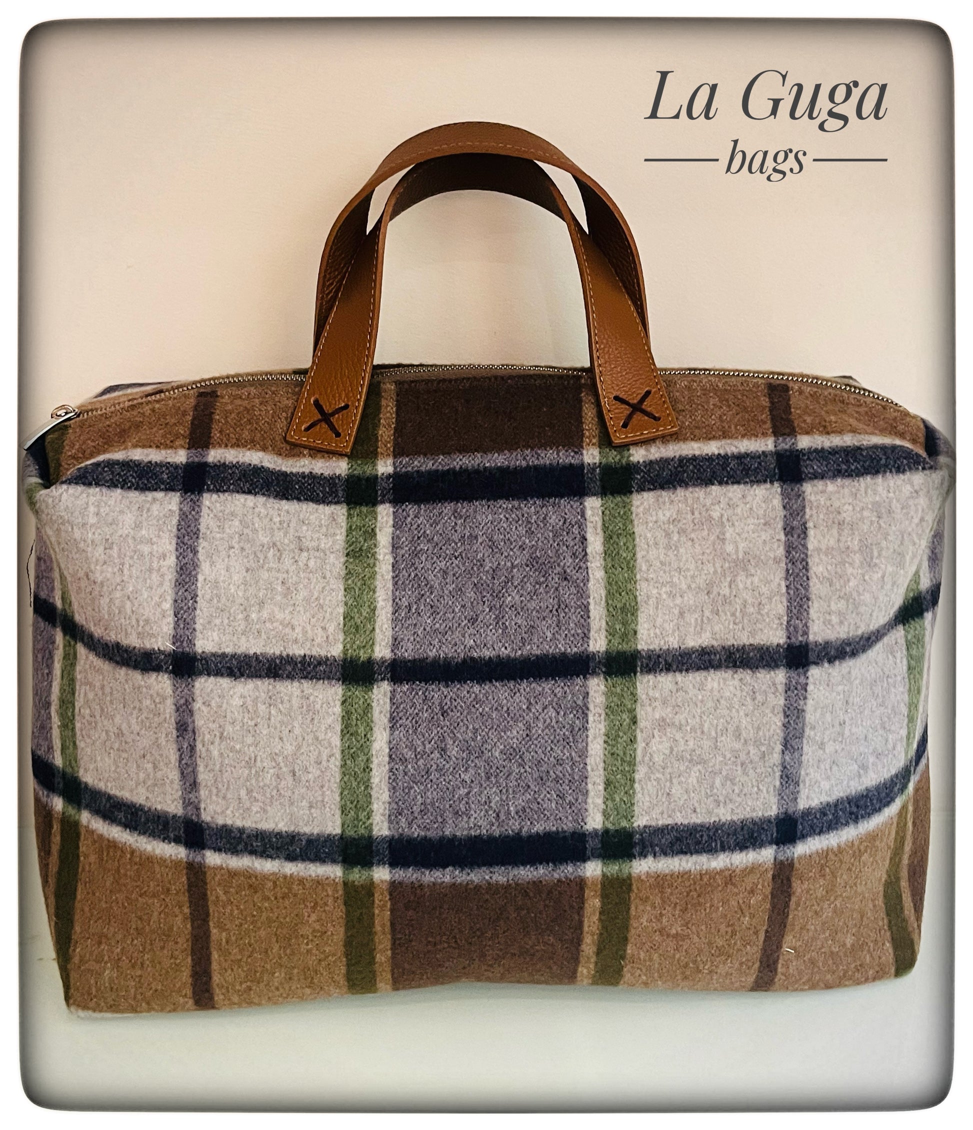 Borsa a mano, in morbida lana, profonda 14 cm, leggermente imbottita, cerniere in brunito di 41 cm, manici in pelle 38 cm, comoda tasca interna