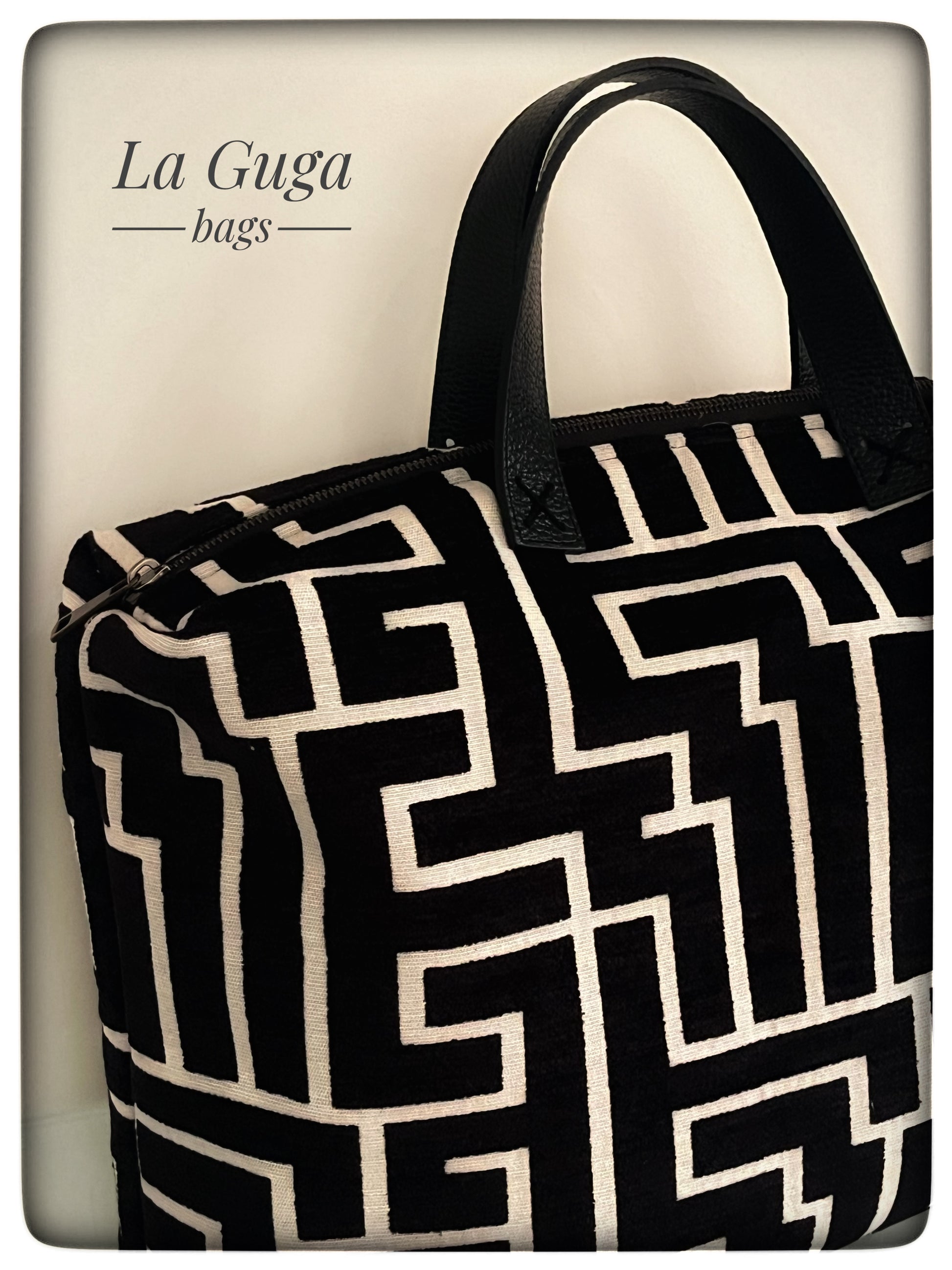 Borsa a mano in tessuto da tappezzeria, profonda 14 cm, leggermente imbottita, cerniere in brunito di 41 cm, manici in pelle 38 cm, comoda tasca interna